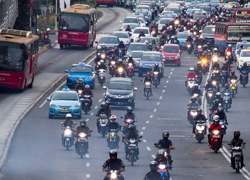 Sejumlah pengendara motor melaju di kawasan Thamrin, Jakarta, Rabu, (29/8). Badan Kesehatan Dunia (WHO) menempatkan Jakarta sebagai kota dengan tingkat polusi tertinggi ketiga di dunia, setelah Meksiko dan Thailand. Sumber polusi terbesar dihasilkan asap kendaraan bermotor yang mencapai 70 persen. MI/ATET DWI PRAMADIA